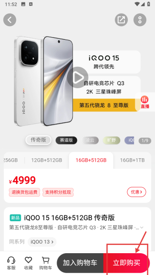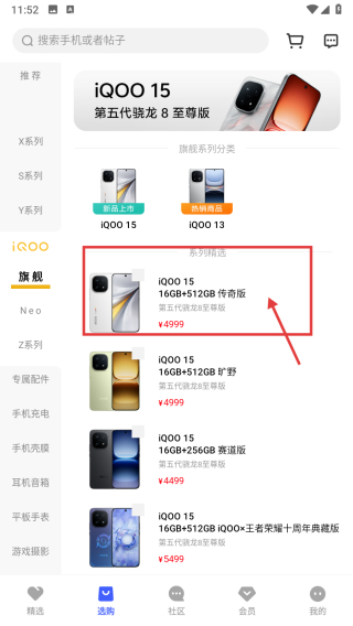 3、在旗艦系列手機(jī)列表頁(yè)面,點(diǎn)擊iQOO-15-16GB+512GB傳奇版手機(jī)條目,進(jìn)入手機(jī)詳情頁(yè)面。