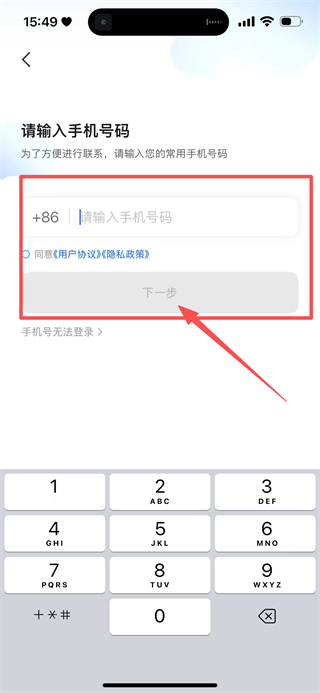 3、在手機(jī)號登錄頁面,輸入手機(jī)號碼,即可點(diǎn)擊下一步。