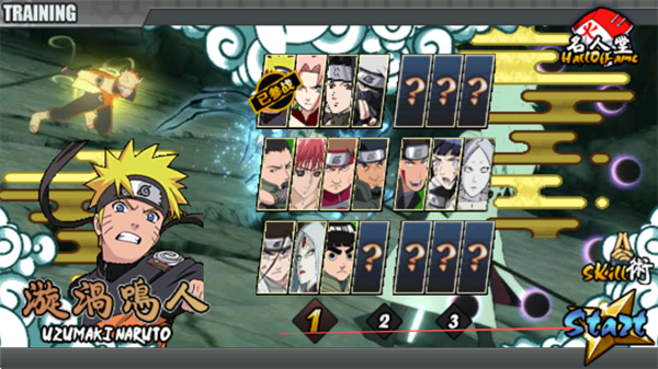 1、在角色選擇界面,選擇漩渦鳴人等已解鎖角色,點擊Start進入游戲。