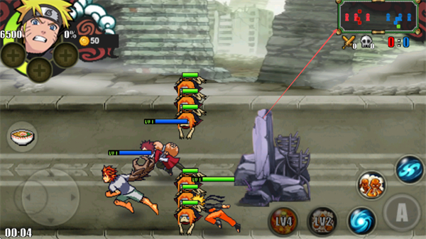 3、在廢墟場景中,與多名敵方角色如我愛羅戰(zhàn)斗,利用走位調(diào)整陣型,發(fā)起進攻。