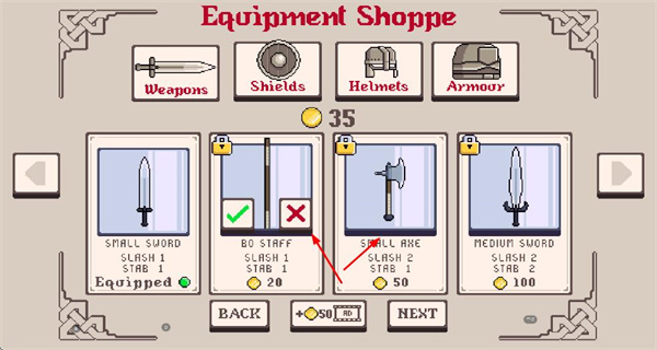 2、在裝備商店,可花費(fèi)金幣購(gòu)買(mǎi)武器、盾牌、頭盔、盔甲等裝備,提升角色戰(zhàn)斗能力。