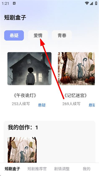 1、在短劇盒子頁面,點(diǎn)擊愛情標(biāo)簽,切換到愛情類短劇列表。