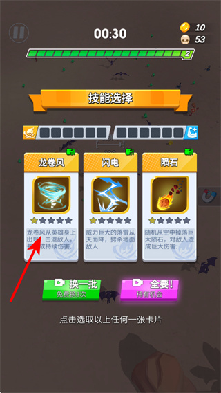 4、選擇龍卷風(fēng)等技能卡片,技能選擇是強(qiáng)化戰(zhàn)力的重要操作,選擇后可獲得對(duì)應(yīng)技能,在戰(zhàn)斗靈活運(yùn)用提升戰(zhàn)斗效率。
