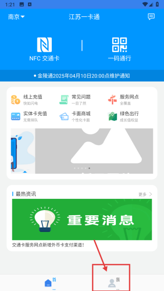 1、打開江蘇一卡通APP,點擊底部我選項,進(jìn)入個人中心頁面。