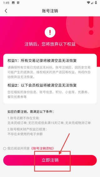 4、在注銷說(shuō)明頁(yè)面,勾選協(xié)議后點(diǎn)擊立即注銷按鈕,完成賬號(hào)注銷操作。