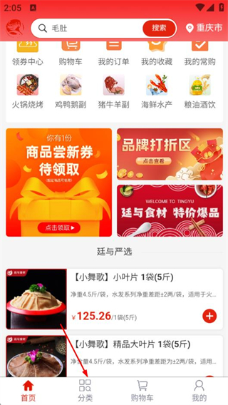 1、在廷與食材速凍鮮品選購首頁,點擊底部分類選項,進(jìn)入分類頁面。