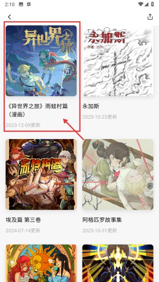 4、在動漫類創(chuàng)作列表中,點擊異世界之旅漫畫封面,進入作品詳情頁。