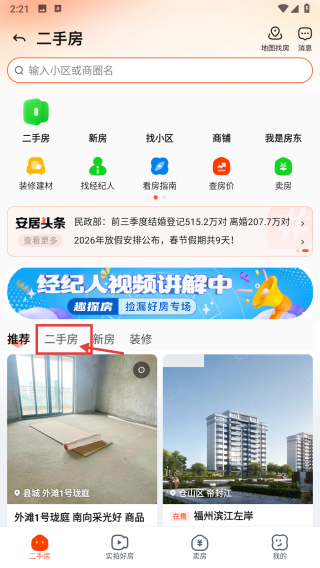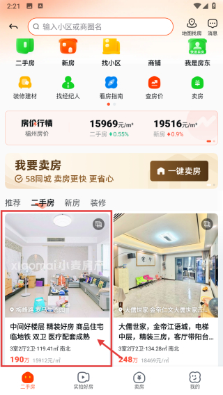2、在二手房專(zhuān)區(qū),點(diǎn)擊二手房標(biāo)簽,篩選出二手房房源列表。