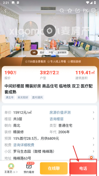 4、在房源詳情頁(yè),可點(diǎn)擊電話(huà)按鈕,聯(lián)系經(jīng)紀(jì)人咨詢(xún)房源信息。