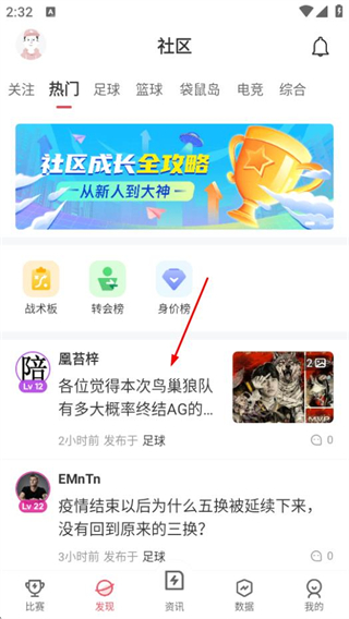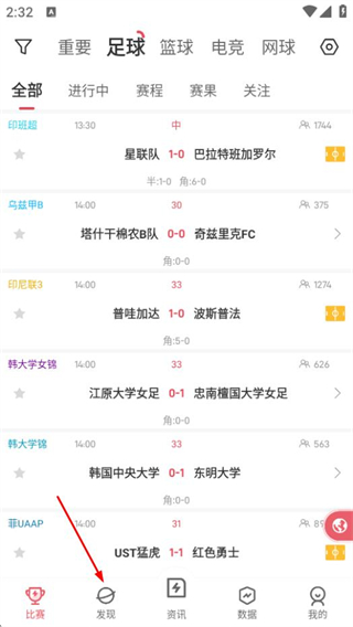 1、在雷速體育首頁(yè),點(diǎn)擊底部發(fā)現(xiàn)選項(xiàng),進(jìn)入社區(qū)頁(yè)面。