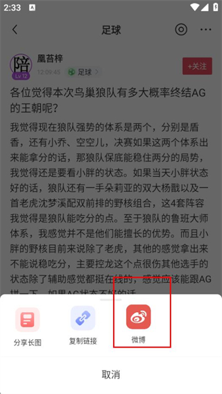 4、在分享選項(xiàng)中,選擇微博,完成帖子分享操作。
