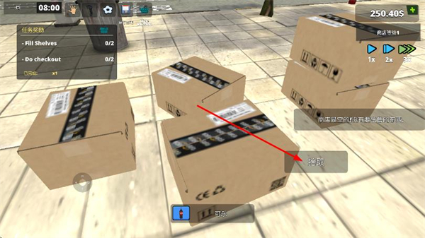 3、選購的商品,會(huì)出現(xiàn)在室外區(qū)域,點(diǎn)擊拾取貨物紙箱,將商品搬運(yùn)至超市內(nèi)。