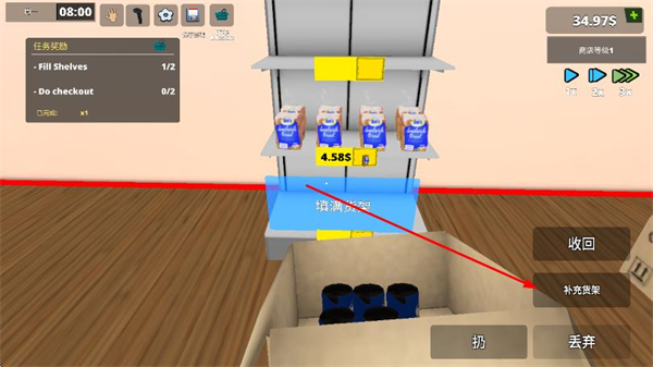 4、將采購的商品搬到超市內(nèi)后,點(diǎn)擊右下方的補(bǔ)充貨架按鈕,即可完成陳列商品。