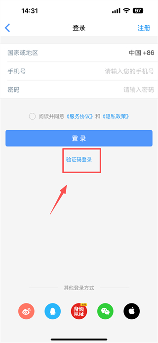 3、在登錄界面,點擊驗證碼登錄選項,切換至驗證碼登錄頁面。