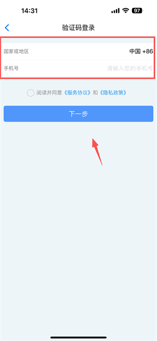 4、在驗證碼登錄頁面,填寫手機號并勾選協(xié)議后,點擊下一步按鈕,完成賬號登錄。