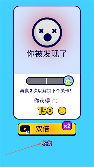 4、若被發(fā)現(xiàn),會顯示你被發(fā)現(xiàn)了,可領取金幣獎勵,點擊收集繼續(xù)游戲,再贏2次可解鎖下一關。