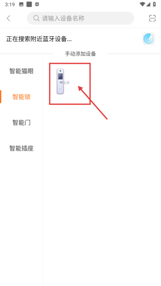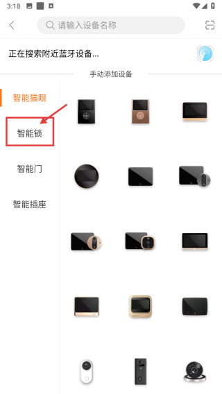 2、在設備添加界面,點擊智能鎖分類標簽,篩選出智能鎖設備列表。