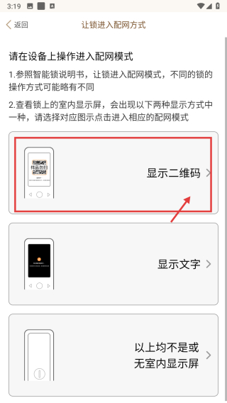 4、在配網(wǎng)方式選擇頁面,點擊顯示二維碼選項,按照提示完成智能鎖配網(wǎng)操作。