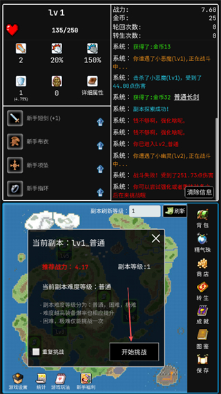 2、查看副本推薦戰(zhàn)力,點(diǎn)擊開始挑戰(zhàn),進(jìn)入副本與怪物戰(zhàn)斗,積累經(jīng)驗(yàn)和金幣。