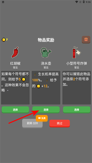 1、在游戲中,選擇澆水壺類物品獎勵,物品選擇是提升資源獲取的關(guān)鍵操作,選擇后可增加生長機率并獲得金幣。
