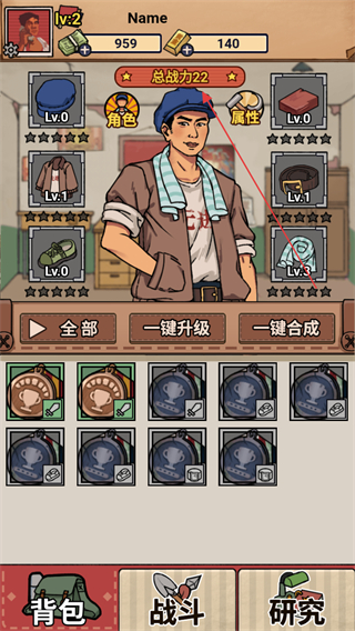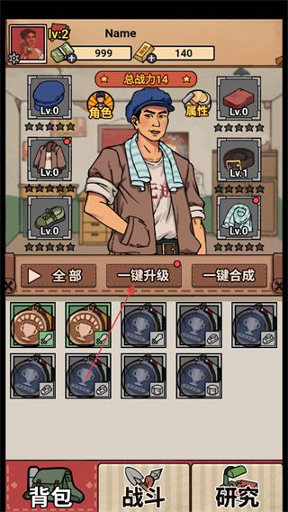 1、進(jìn)入游戲主界面,點擊一鍵升級按鈕,消耗資源提升裝備等級,增強(qiáng)總戰(zhàn)力。