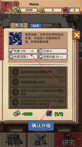 3、進(jìn)入研究頁面,選擇技能,如電擊,銷號金幣和碎皮,進(jìn)行升級。