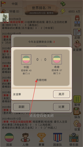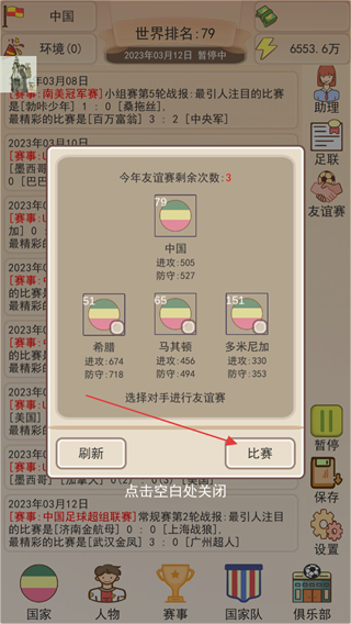 2、進入友誼賽界面,選擇對手如希臘,點擊比賽按鈕,開啟友誼賽。