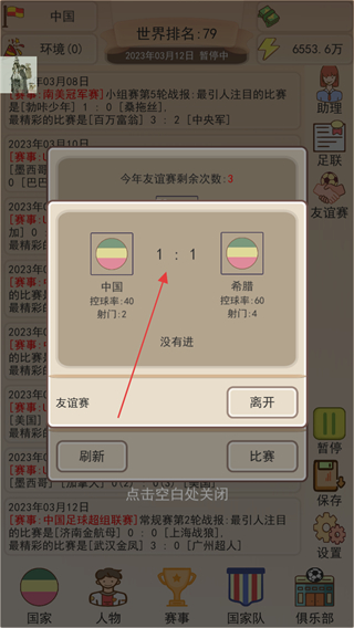 4、友誼賽結束后,查看比賽結果如1:1平局,積累賽事經驗,提升球隊世界排名。