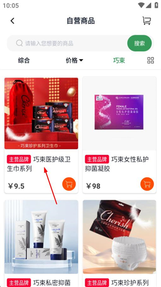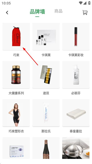 2、在品牌墻頁(yè)面,點(diǎn)擊巧束品牌,進(jìn)入自營(yíng)商品頁(yè)面。