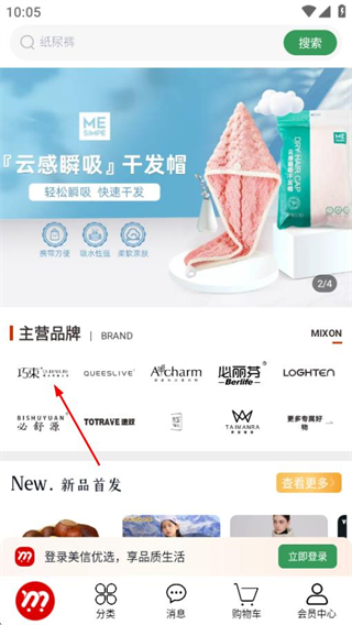 1、在美信優(yōu)選首頁(yè),點(diǎn)擊巧束品牌選項(xiàng),進(jìn)入品牌墻頁(yè)面。