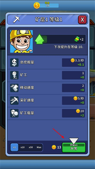 1、進入礦層升級界面,消耗金幣提升礦層等級,可增加總挖掘量、礦工數(shù)量、移動速度、采礦速度、礦工載量等屬性。