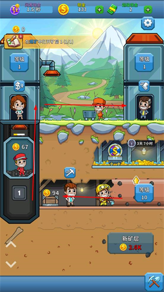 2、在挖礦場景中,派遣礦工在礦層內(nèi)開采礦石,礦石通過運輸系統(tǒng)運送,積累金幣資源。