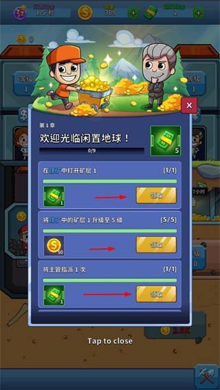 3、完成游戲任務(wù)如在礦場中打開礦層、提升礦層等級、招募主管,可獲得鉆石、金幣等獎勵,加速游戲發(fā)展。