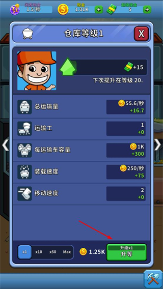 4、進入倉庫升級界面,消耗金幣提升倉庫等級,增加總運輸量、運輸工數(shù)量、每運輸車容量、裝載速度、移動速度等屬性。