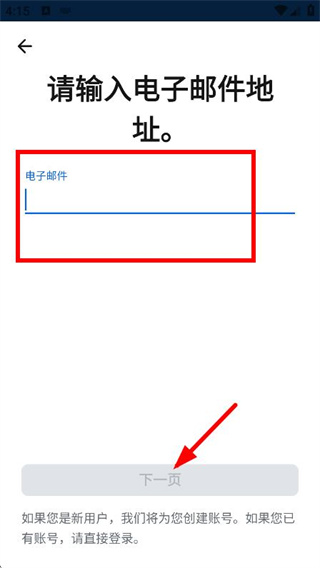 4、在電子郵件輸入頁面,輸入電子郵件地址后點(diǎn)擊下一頁,完成注冊(cè)操作。