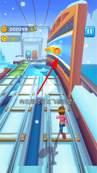 4、按照提示滑動屏幕進行飛檐走壁操作,執(zhí)行獲取資源的重要操作,在特殊場景中移動并收集金幣,提升收益。