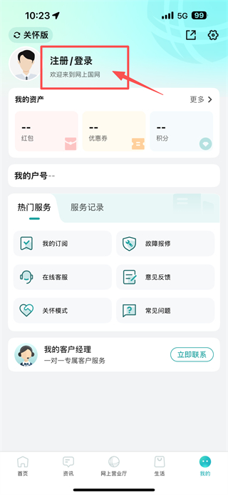 2、在個人中心,點擊注冊/登錄區(qū)域,進入登錄界面。