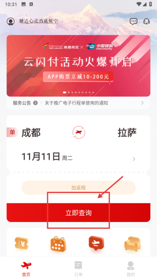1、打開機票預訂類APP,在首頁點擊立即查詢按鈕,進入航班查詢頁面。