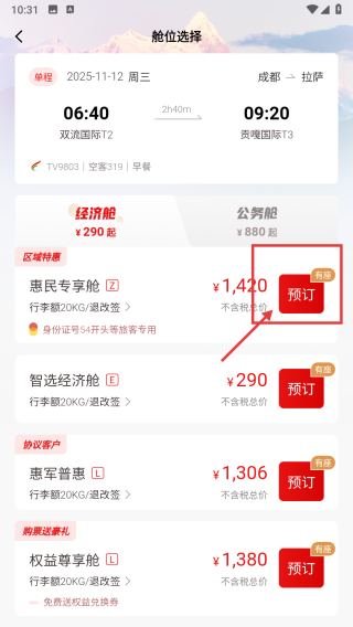 4、在艙位選擇頁面,點擊對應艙位的預訂按鈕,完成航班艙位的預訂操作。