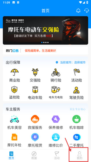 1、打開(kāi)機(jī)車(chē)服務(wù)類APP,點(diǎn)擊底部我的選項(xiàng),進(jìn)入個(gè)人中心頁(yè)面。