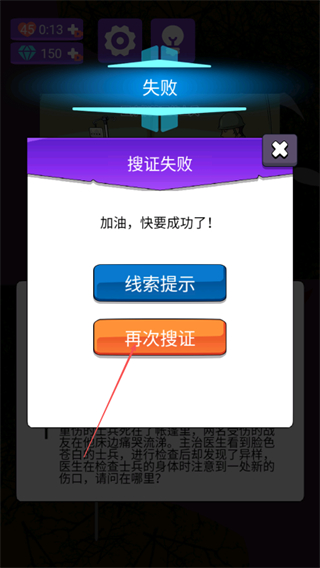 2、若搜證失敗,可選擇再次搜證重新嘗試,或點(diǎn)擊線索提示獲取幫助。