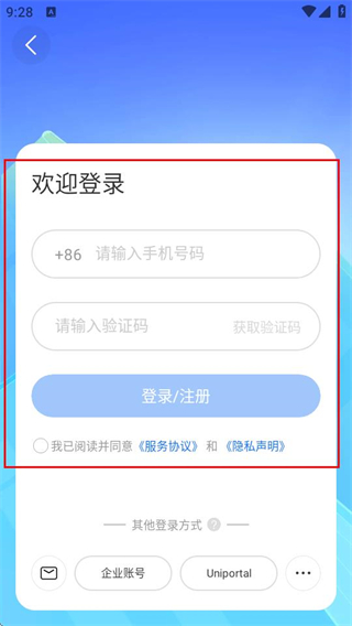 3、登錄頁面,輸入信息,勾選協(xié)議后點擊登錄,可完成登錄。
