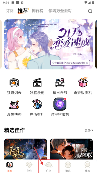 1、打開(kāi)漫畫創(chuàng)作類APP,點(diǎn)擊底部廣場(chǎng)選項(xiàng),進(jìn)入廣場(chǎng)頁(yè)面。