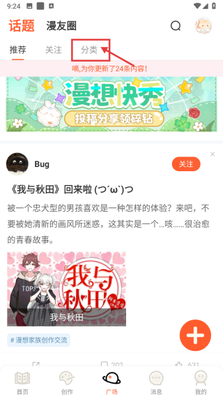2、在廣場(chǎng)頁(yè)面,點(diǎn)擊分類標(biāo)簽,進(jìn)入話題分類頁(yè)面。