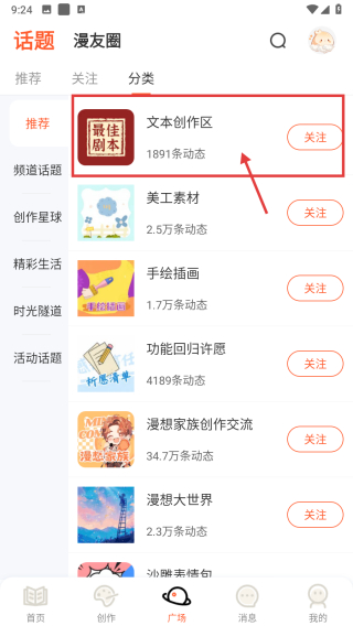 3、在話題分類頁(yè)面,選擇文本創(chuàng)作區(qū)話題,進(jìn)入該話題詳情頁(yè)面。