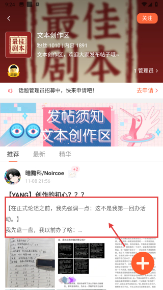 4、在話題詳情頁(yè)面,查看YANG]創(chuàng)作的初心帖子內(nèi)容,了解創(chuàng)作討論信息。