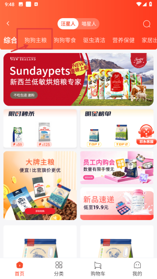 2、在商城頁面,點擊狗狗主糧分類標簽,進入狗狗主糧商品列表頁面。
