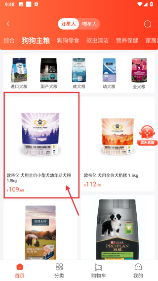 3、在狗狗主糧商品列表頁面,選擇歐帝億犬用全價小型犬幼年期犬糧1.5kg商品,進入商品詳情頁面。