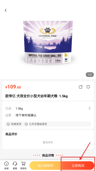 4、在商品詳情頁面,點擊立即購買按鈕,推進商品購買流程。