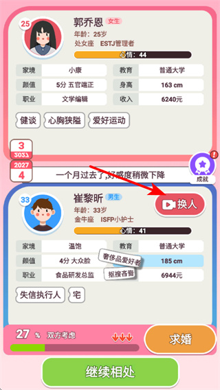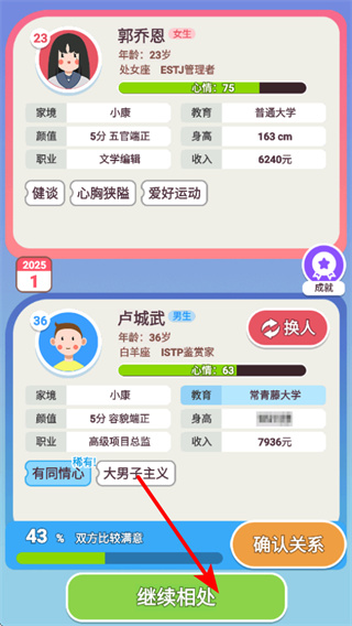 4、在戀愛相處中調(diào)整對象,對象調(diào)整是優(yōu)化體驗的重要操作,調(diào)整后可更換相處對象,尋找戀愛伴侶以豐富游戲體驗。